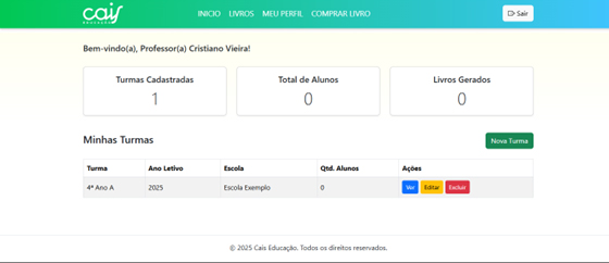 O painel exibe um resumo com as principais informações: Turmas Cadastradas, Total de Alunos e Livros Gerados. Se for o primeiro acesso, esses dados aparecerão com “0”.