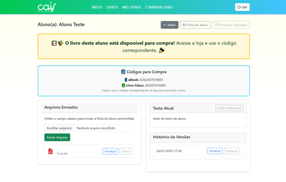 Na página de detalhes do aluno haverá informações sobre a finalização da produção do livro e novamente será informado o código para compra do livro;