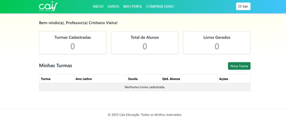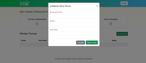 Na própria tela inicial, o professor pode clicar no botão “Nova Turma” para começar a cadastrar suas turmas e alunos. Esse é o primeiro passo para dar inicio à criação de livros dos seus alunos.