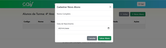 Ao clicar no botão “+ Novo Aluno”, um formulário em formato de janela (modal) será exibido na tela, como o exemplo abaixo: