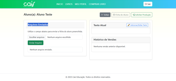 Depois de preencher o conteúdo (texto e/ou ficha), o professor deve clicar no botão “Solicitar Produção” no topo da página do aluno.
